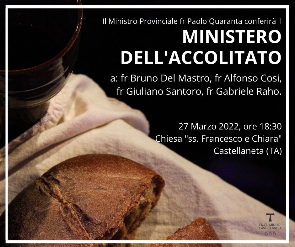 Condividiamo una gioia fraterna annunciando il conferimento del Ministro di ACCOLITO ai nostri fratelli Bruna Del Mastro, Alfonso Cosi, Giuliano Santoro e Gabriele Raho.