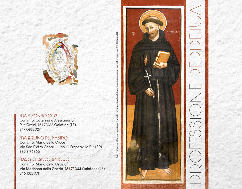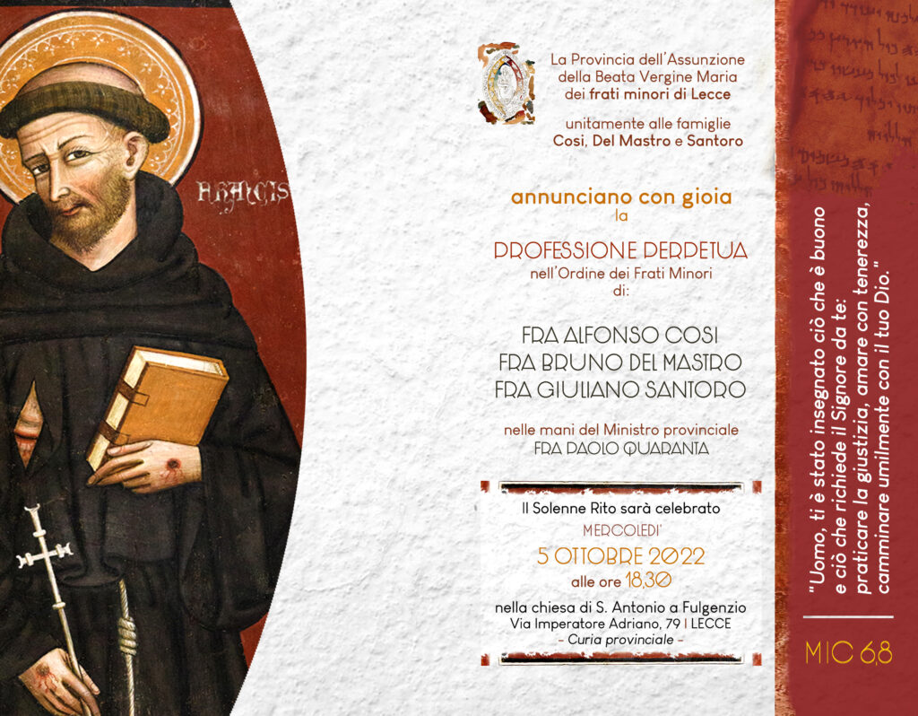 La nostra Provincia religiosa si prepara con gioia a celebrare la Professione perpetua dei voti dei nostri fratelli Alfonso COSI, Bruno DEL MASTRO e Giuliano SANTORO. Chiediamo a tutti la carità di voler accompagnare con la preghiera l’offerta che questi nostri fratelli faranno della loro vita a Dio e ai fratelli il prossimo 5 ottobre.