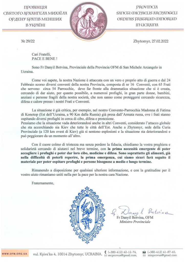 La Curia Generale OFM, attraverso la Fondazione OFM Fraternitas, si è attivata immediatamente per fornire tutto il sostegno possibile ai frati che affrontano in prima persona il dramma della guerra.